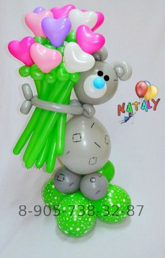 Мишка Тедди с букетиком сердечек рекомендован в качестве подарка как ребенку , так и взрослому. Идеальный подарок на день рождения , ко Дню влюбленных , а также на любой случай. Высота около метра.