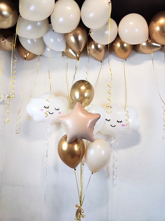 Состав:20гелиевых шаров под потолок, 2облака на грузиках,фонтан 6 штук шаров и одна звезда