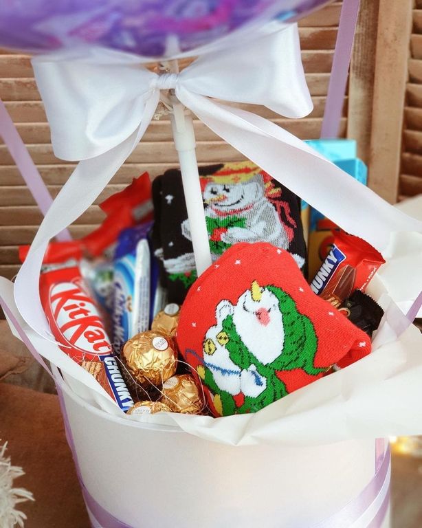 2 пары носков, 2 шт молочных Toblerone, 4 шт KitKat, 2 шт Bounty mini, 1 шт Milky Way, 1 шт Mars, 6 шт Ferrero.