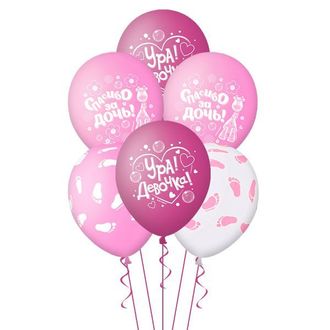 Шары из натурального латекса с рисунками по всему шару шелкография - Ступня, Спасибо за дочь, Ура девочка. Цветовая гамма - белые, светло-розовые, ярко-розовые и прозрачные. Размер шаров 30 см, наполнены гелием и обработаны специальным составом.