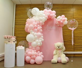 Нежная, трогательная зона для первых семейных фото с малышкой в розовых тонах и плюшевым мишкой.Под ключ с доставкой в пределах мкад