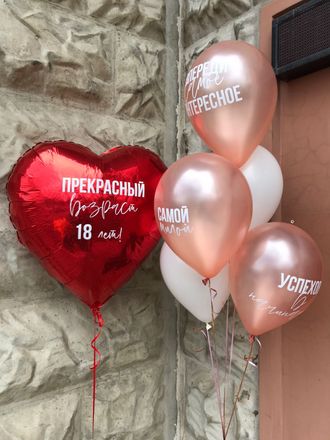 Состав:1. Большое сердце 70 см с индивидуальной надписью 2.Фонтан из 5 шаров( 3 шара с идивидуальной надписью)