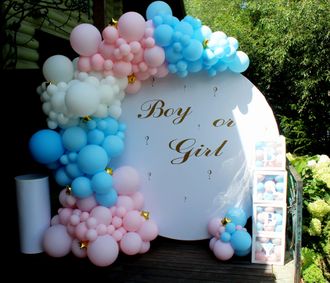Фотозона круг на гендерную вечеринку 2м диаметр, тубус для торта, кубики baby, монтаж включен в стоимость, доставка расчитывается отдельно