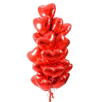 Представьте, в каком восторге будет женщина, увидев фонтан из 25 ярких фольгированных шаров-сердечек насыщенного красного цвета, украшенных атласной лентой.